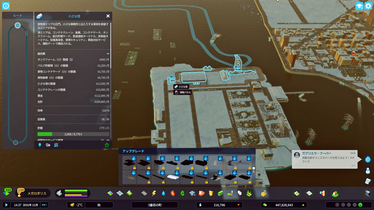釣りの区画と養殖の区画を指定し、そこへの航路を設定し、冷蔵倉庫を配置して…と、なかなか手順が多くて面倒です。