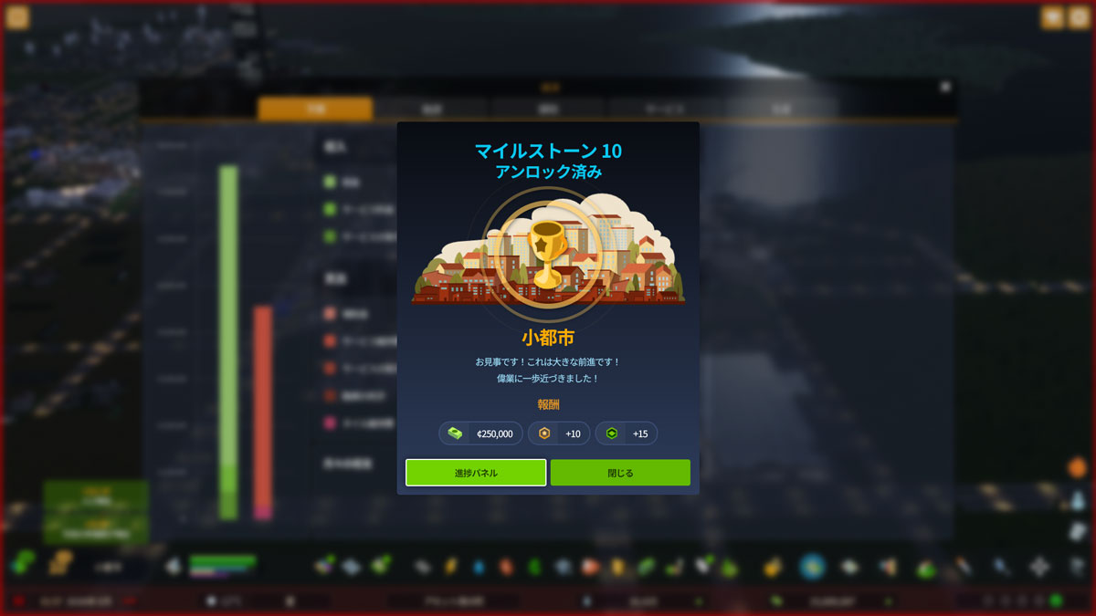 今回は資源不足問題への対応とマイルストーン10の達成、そして新しい日本風アセットの導入を中心にプレイを進めました。