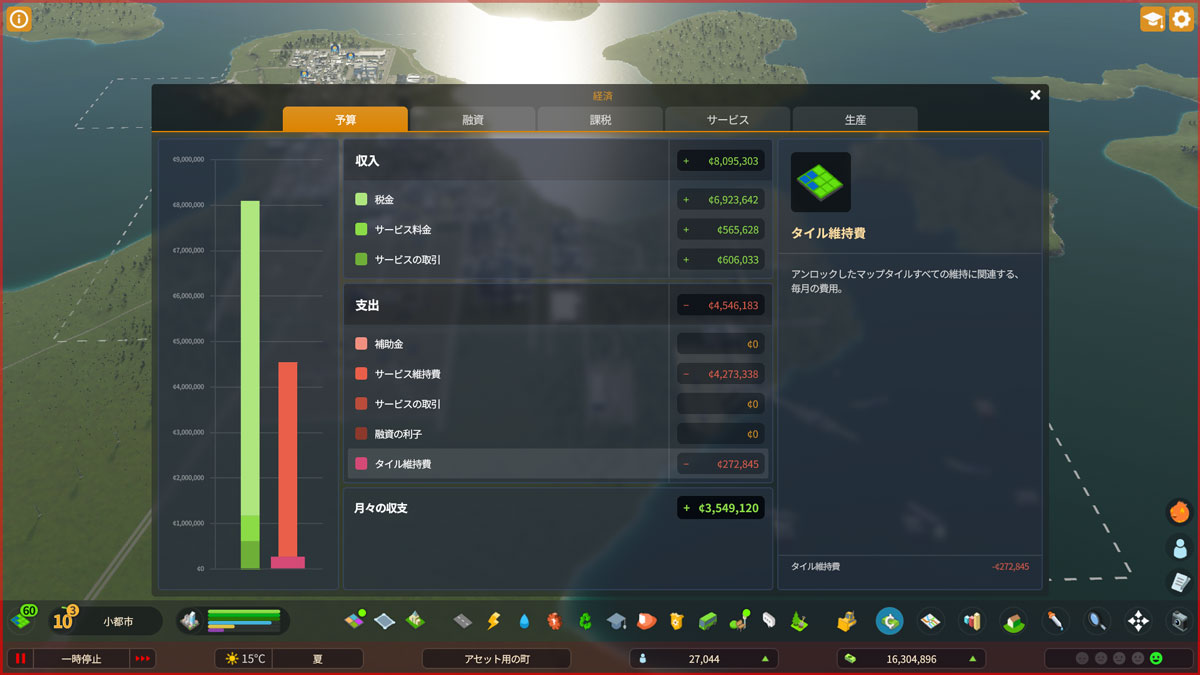 マップタイルを若干拡大したことで維持費がかなり増加してきていますが、月々の収支は約3,549,120となっています。
