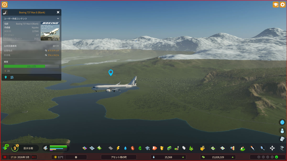 Boeing 737 MAX 8の公式コアパックで、Cities: Skylines IIのゲームバージョン1.5.2f1向けに再構築されたものです。