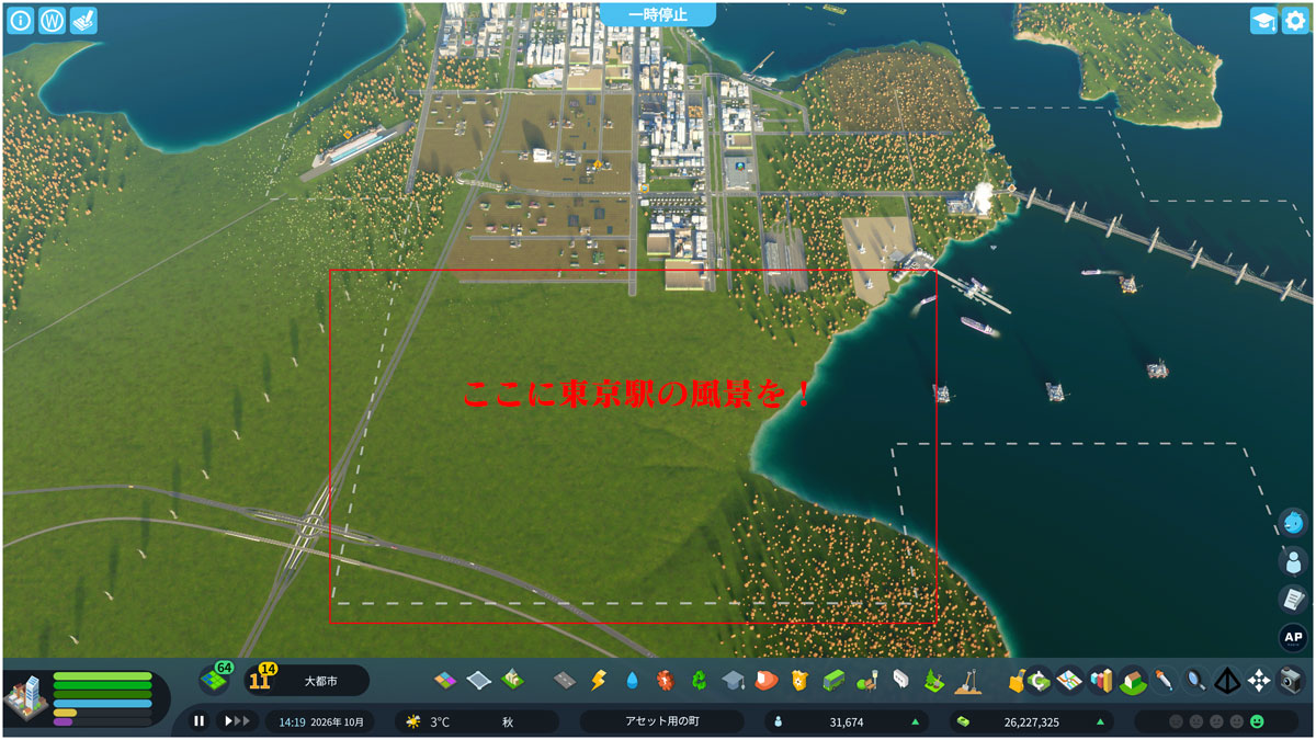 土地が確保できたら東京駅を配置して鉄道路線を敷設。