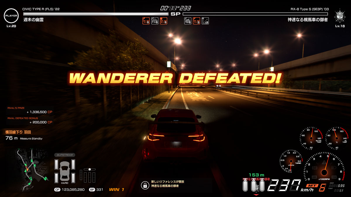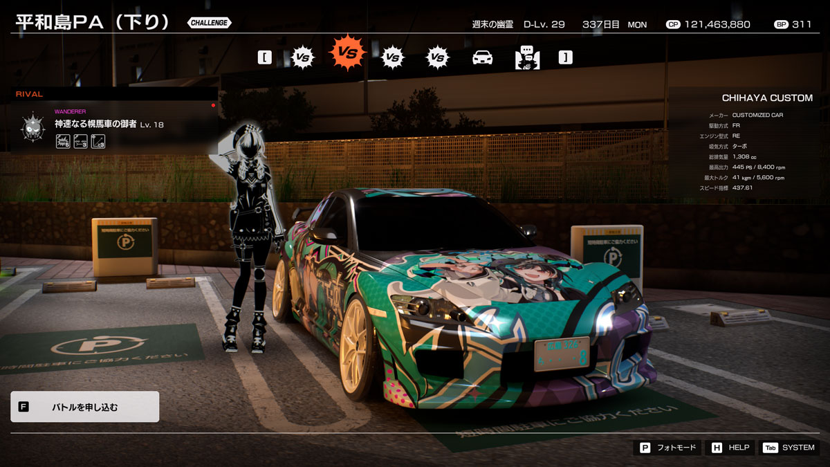 輪堂千速さんとのバトルは、現時点では比較的簡単に勝利できるレベルでしたが、彼女の専用バトル曲や個性的な痛車デザインなど、演出面での工夫が光っていました。