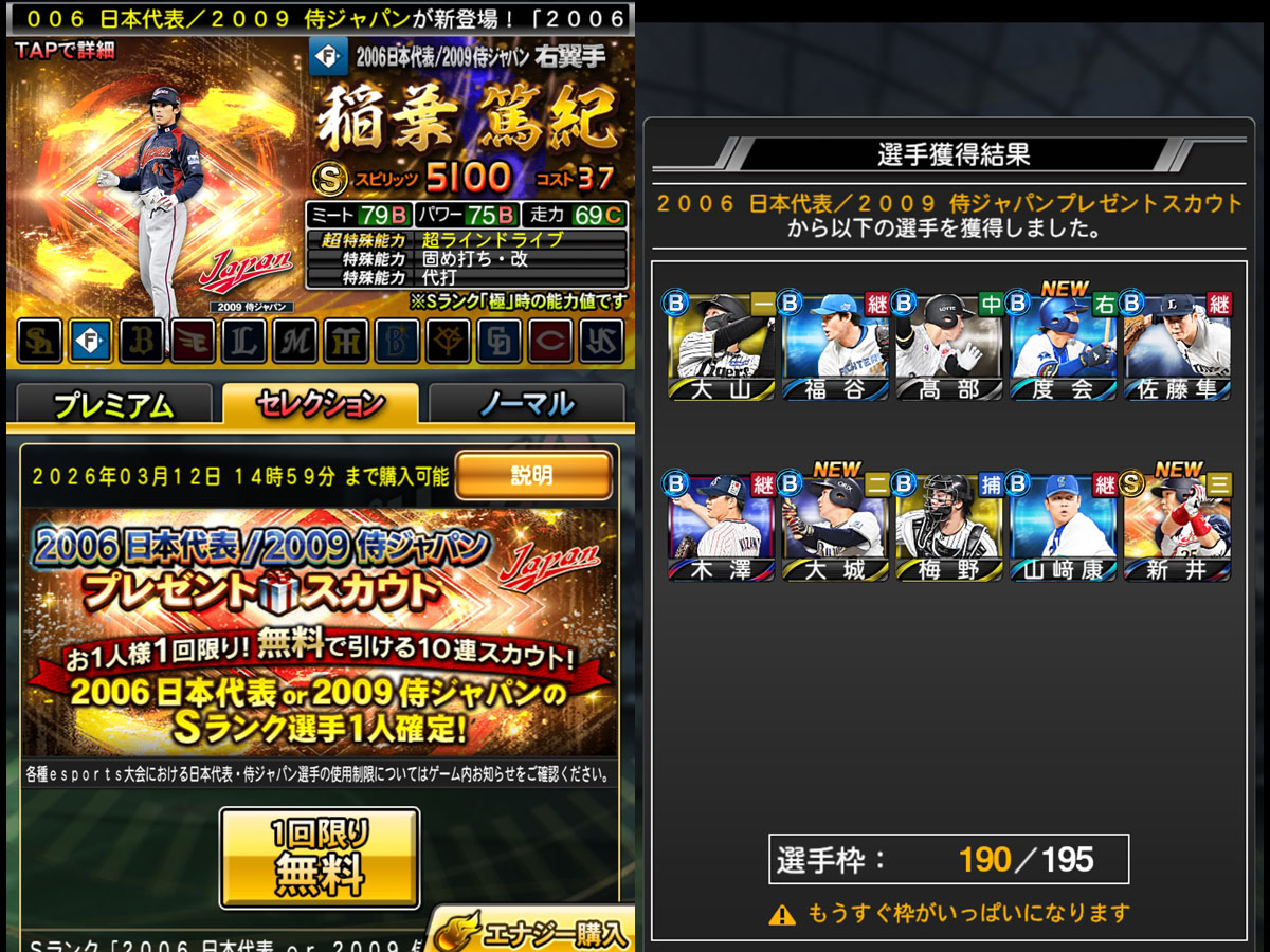 WBCが始まったことを記念してか、2006日本代表/2009侍ジャパンのプレゼントスカウトが配布されました。