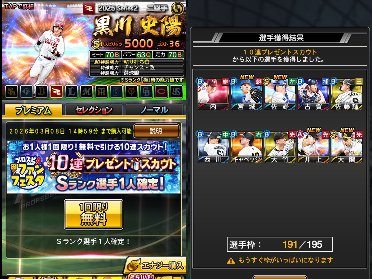 プレゼントスカウトなので正直あまり期待はしていませんが、せっかくなら稲葉選手あたりが出てくれたら嬉しいなぁ…という気持ちで回しました。